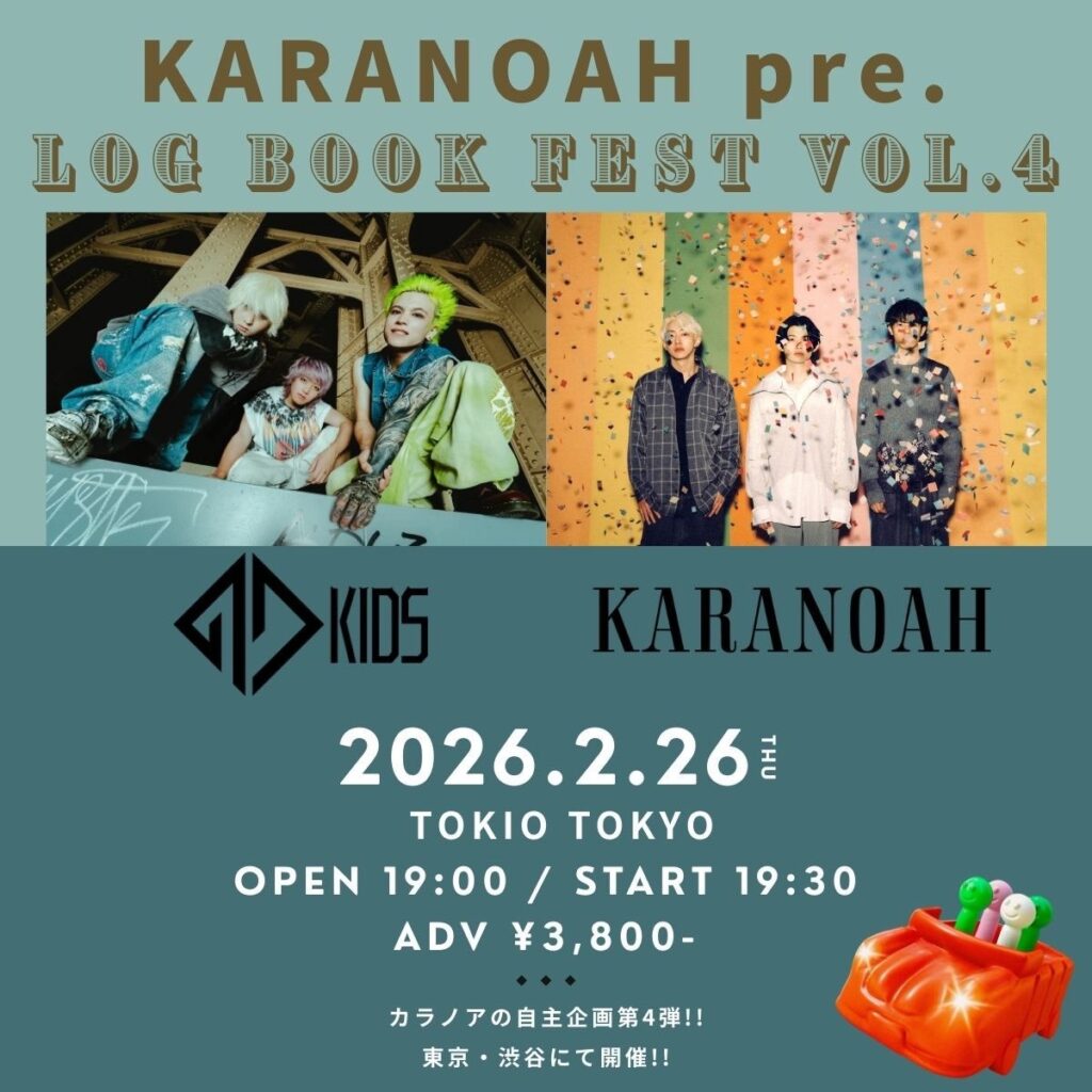 昨年メジャーデビューしたカラノアが2月26日に自主企画「Log Book Fest. Vol.4」をTOKIO TOKYOにて開催します。今回は’97,Kidsを招いてのツーマンライブで行うため、長尺でカラノアを楽しめるファン待望の1日となっています。