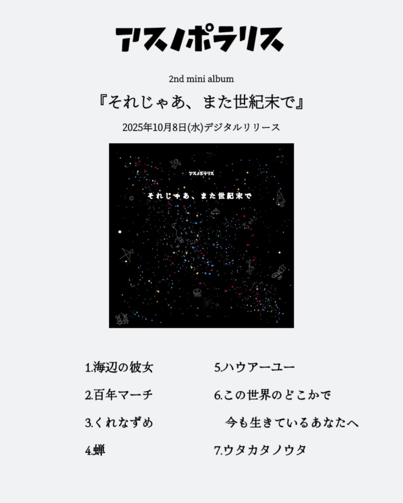 そんな彼らは、10月8日(水)に約3年ぶりとなる2nd mini album『それじゃあ、また世紀末で』のリリースを予定し、9月17日(水)には『海辺の彼女』のMVを公開するなど勢力的に活動の場を広げている。