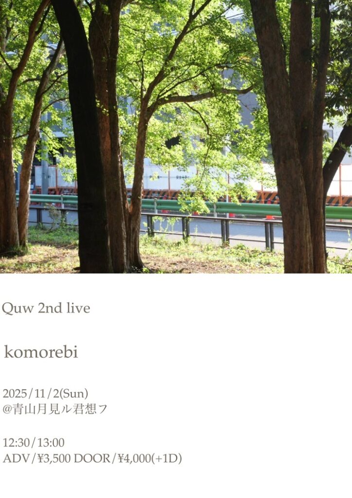 Quwは自身2回目のバンドスタイルでのワンマンライブ「Quw 2nd live “komorebi”」を11月2日(日)に青山月見ル君想フにて開催することが決定しており、チケットが発売中。精力的に活動するQuwに注目していただきたい。