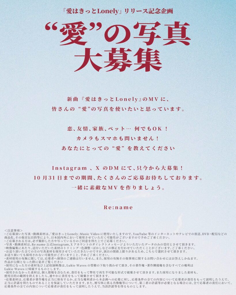 新曲『愛はきっとLonely』のMVに、皆さんの“愛”の写真を使いたいと思っています。
