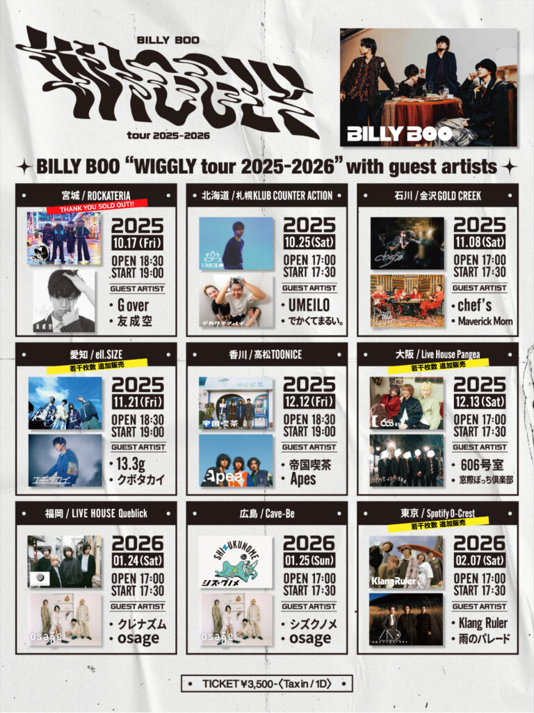 また、今月より開催しているBILLY BOOの全国対バンツアー「BILLY BOO “WIGGLY tour 2025-2026”」に関して、大阪・愛知・東京公演が既に完売となっているが、完売公演へ多数の問い合わせを受け、明日30日(木)12:00より、若干枚数の追加販売がを先着で受け付ける。お見逃しなく。