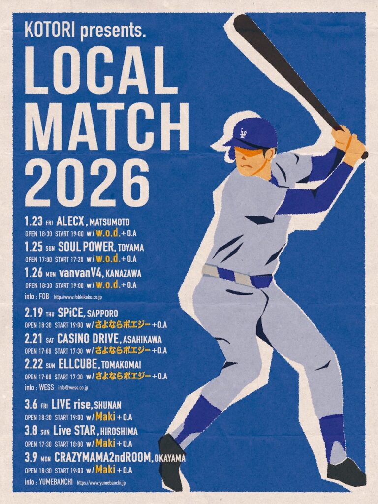 KOTORIが行きたい場所で対バンしたいバンドと共演する『LOCAL MATCH 2026』の対バンアーティストが発表された。松本・富山・金沢公演にw.o.d.、札幌・旭川・苫小牧公演にさよならポエジー、周南・広島・岡山公演にMakiが決定した。