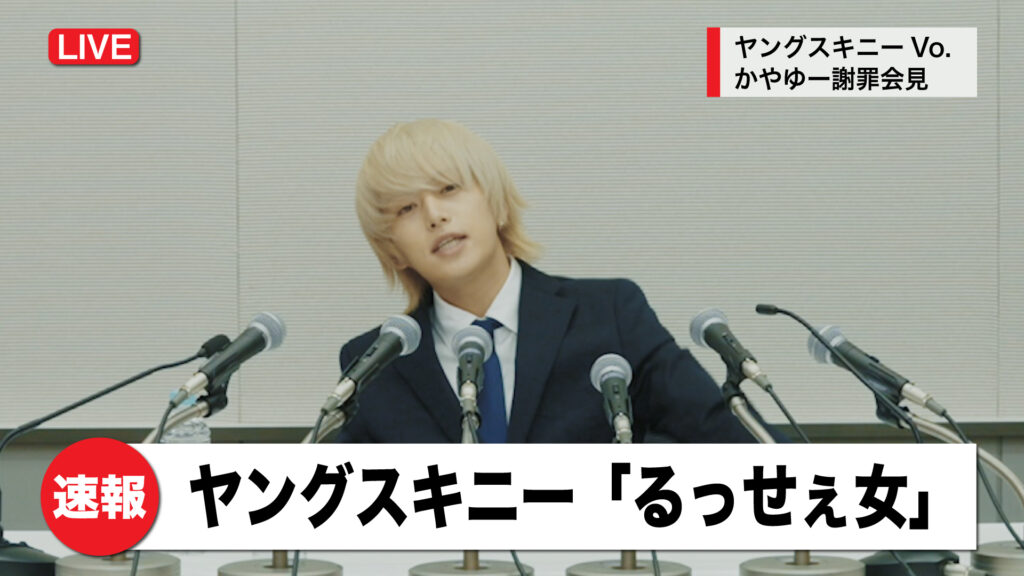 MVの監督・撮影は、ヤングスキニー作品でお馴染みの軍司拓実が担当。サビの「最低な発言でした」というフレーズから着想を得て、謝罪会見をユーモラスに再構築した映像世界を展開している。MVでは、かやゆーが令和イチのお騒がせバンドマンらしいキャラクターを存分に発揮。多彩な表情や細やかな仕草から、映像ならではの遊び心と表現力が感じられ、見終わったあとも余韻が残る映像に仕上がっている。