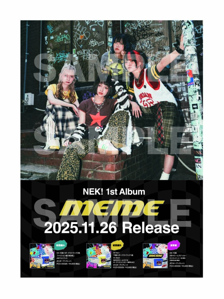 その他にも、リリースを記念したキャンペーンは多数開催中。リリース直後の11月28日に横浜ReNY betaで開催する『NEK! 1st アルバム「MEME」リリース記念ワンマンライブ』のチケットは完売しているが、その翌日にはタワーレコードの対象店舗にて『MEME』を購入した方が参加出来るタワーレコード渋谷店でのインストアイベントが開催される。また、タワーレコード渋谷店、新宿店、町田店ではサイン入りパネル展示も開催。