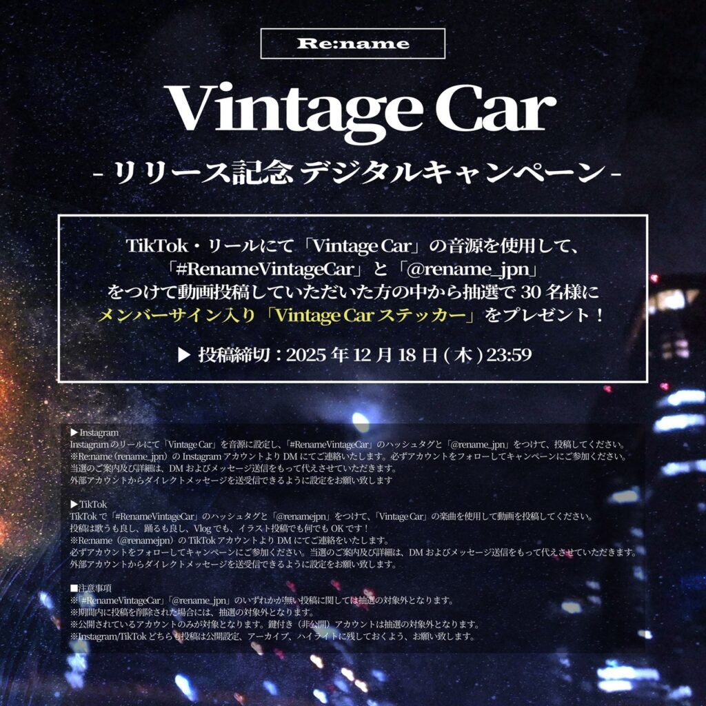 TikTok・リールにて「Vintage Car」の音源を使用して、「#RenameVintageCar」と「@rename_jpn」をつけて動画投稿していただいた方の中から抽選で 30名様にメンバーサイン入り「Vintage Car ステッカー」をプレゼント!