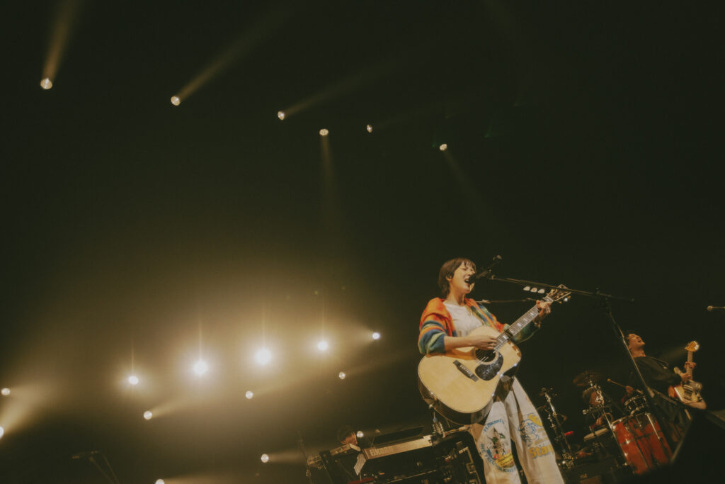 開演時刻を過ぎてあいみょんがステージに登場すると、ライブは「愛の花」からスタート。前半は弾き語りでしっとりと聴かせ、途中からサポートメンバーの演奏が加わり、スケール感のある歌声を響かせていく。