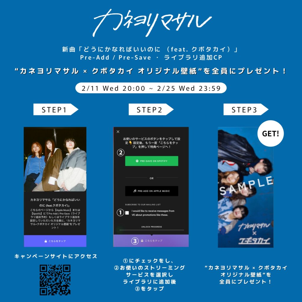 そんな彼女らがシンガーソングライター / ラッパーのクボタカイをフィーチャリングに迎えた初のフィーチャリングソング「どうにかなればいいのに (feat. クボタカイ)」をアルバムに先駆けて本日2月18日(水)配信リリースした。3月11日(水)に2nd Full Album「ヒント」をリリースするカネヨリマサル。