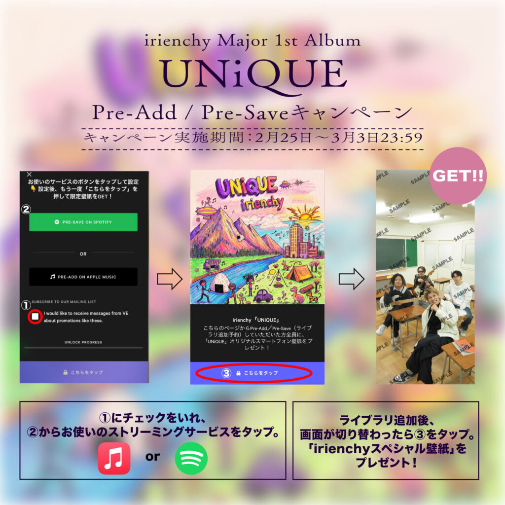 3月5日からは福岡・愛知・大阪・東京の4都市を回る「irienchy Major 1st ALBUM Release TOUR 2026 “UNiQUE”」がスタート!ツアー会場でアルバム「UNiQUE」をライブラリ追加していただくと、会場限定スペシャルステッカーをプレゼント!ぜひ会場に足を運んでいただきたい!