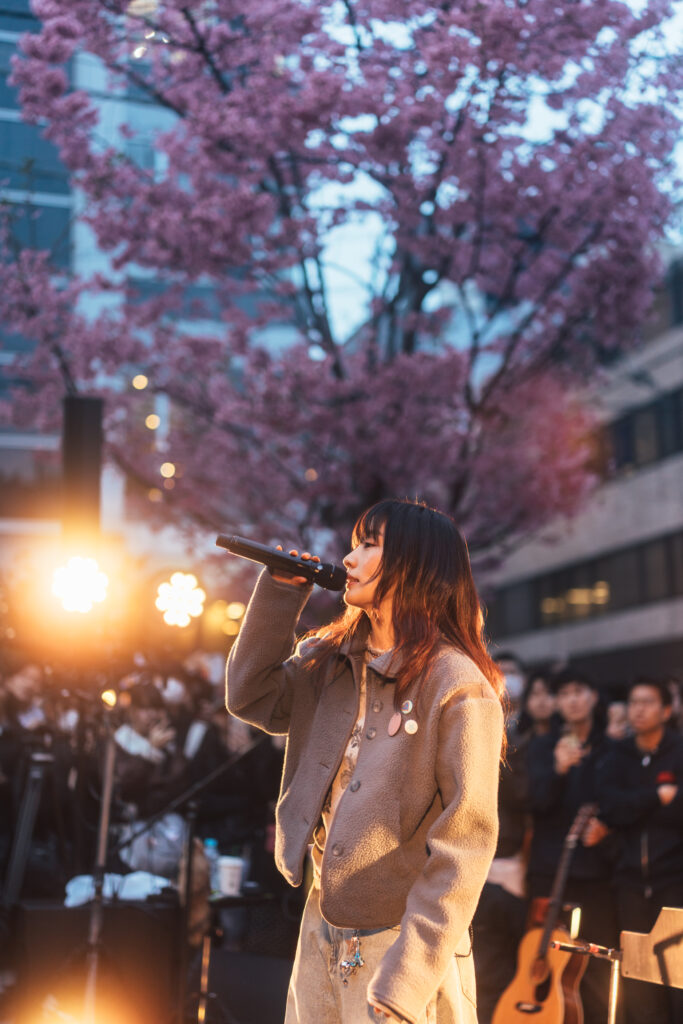 「今までのはリハで、ここからライブを始めていきたいと思います」と言って、1曲目に届けたのは「weekly」。演奏が始まると、屋外用の照明がオレンジ色の光を放った。にしなが歌い始めた瞬間、タイミングよく鮮やかなピンク色に染まった桜の花びらがヒラヒラと舞い、会場に温かい春風が運ばれる。「一緒に歌って」と呼びかけると、みんなで声を合わせ、祝祭のムードに包まれた。2曲目「ねこぜ」では軽やかな音に合わせて再び手拍子が起き、「2番に入ったら“ほっとけー”と言ってください」と呼びかけ、コール&レスポンスで一体感が生まれた。