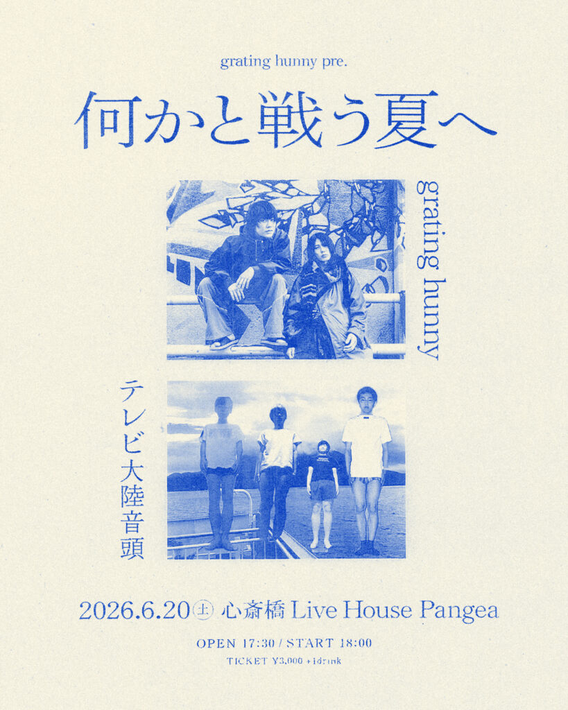 平均年齢19歳、大阪・寝屋川発ロックバンド grating hunny(グレイチングハニー)が、6月20日(土)に心斎橋 Live House Pangeaにて、ゲストにテレビ大陸音頭を迎え、ツーマン企画 grating hunny pre. 『何かと戦う夏へ』を開催することを発表した。