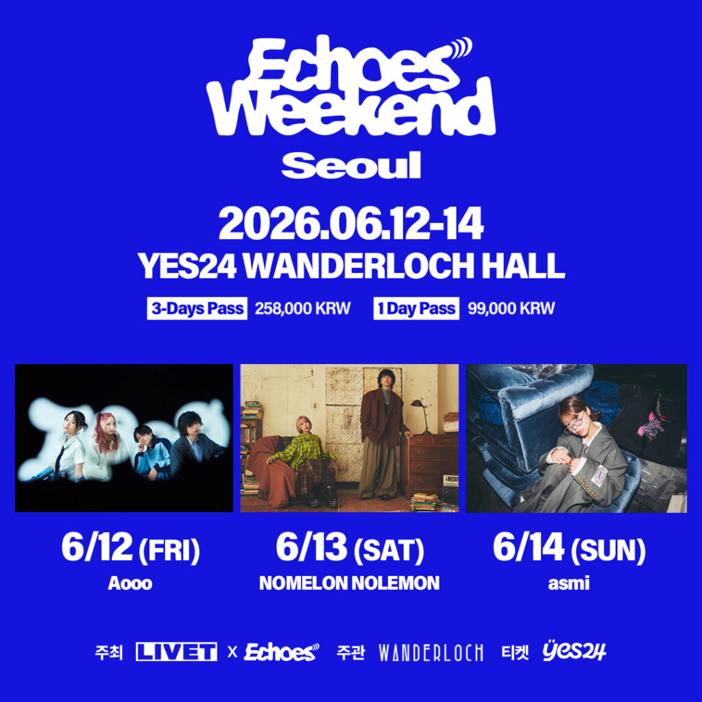 CENTRAL・Echoes Baaも大盛況に終えたばかりのレーベル&マネジメントEchoesに所属する Aooo、asmi、NOMELON NOLEMON の3組が出演するライブイベント「Echoes Weekend Seoul」(2026年6月12日(金)〜6月14日(日)/韓国・YES24 WANDERLOCH HALL)の開催を記念し、合同ファンサイン会″Echoes Joint Fansign″を2026年4月23日(木)に韓国・ソウルのanimate ホンデ店 WHITE HALLにて開催することが決定した。