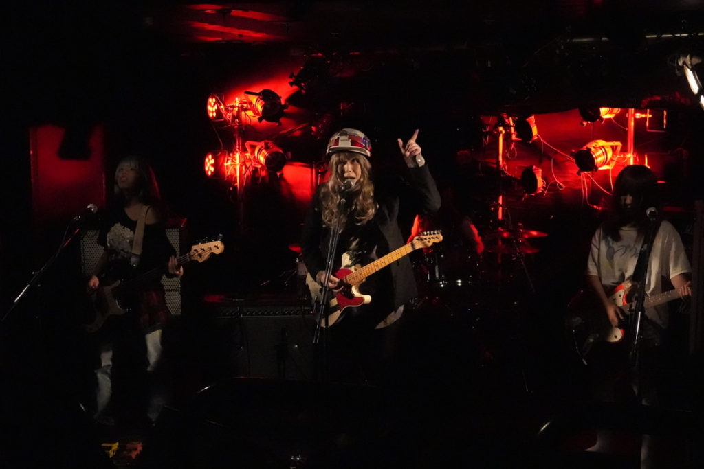 あやか(Sup/Gt)が渋いギターリフを響かせ、時に切り裂くような鋭さを持って観客を揺さぶり、ベースのここな(Sup/Ba)とドラムのちぇるちゃん(Sup/Dr)は荒々しくも重心を低く保ち、混沌としたサウンドをしっかりと地に繋ぎ止める。そこに乗るノイズはただの歪みではなく、生々しい欲望を増幅させるフィルターのようだった。