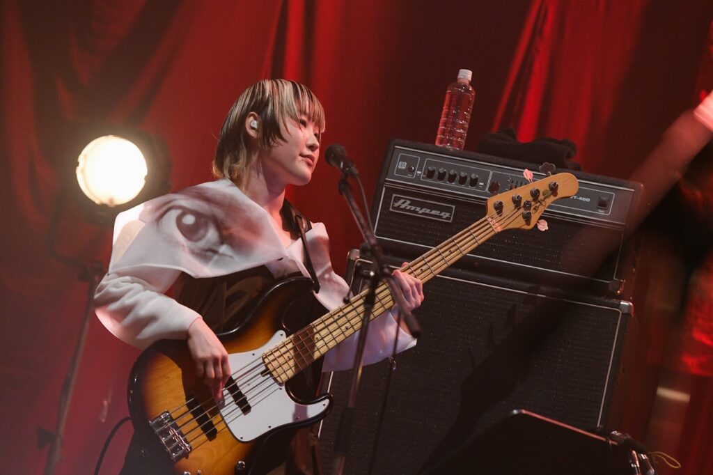 『温度』では、ライブならではのサウンドアレンジが施されていた。石田のサックスが添えるように響き、オオツカマナミ(Ba)のベースラインが、淡く曲の質感の深度を高めていった。音源では繊細に構築されているパートが、ライブではさらに太く温かく、“体温”を持った音楽として目の前に現れる。観客は音が重なっていくたび小さく身体を揺らしながら、その温度を丁寧に受け取った。