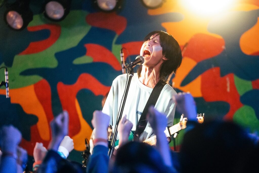 過ごして思ったのは、「こんな毎年気を張ってはやっていけないので、みんなは肩の力を抜いて過ごしてほしいし、自分の楽しいことだけ考えようぜ。俺は曲の中で他人の曲を下げているように捉われがちなんですけど、勘違いしないでほしくないのは、そういうことするのダサいよと言ってるんですよ。だから強制ではないけど、みんなは好きな曲を好きな人と好きなように聴けるのが1番幸せだから、そうしてほしいなと思います」と伝え、「うん、いっぱい喋った!ポンツクピーヤでした!」と心なしか晴れやかに『リビング・スーサイダル』を鳴らし始めた。中江の「ワン、ツー!」も響く。