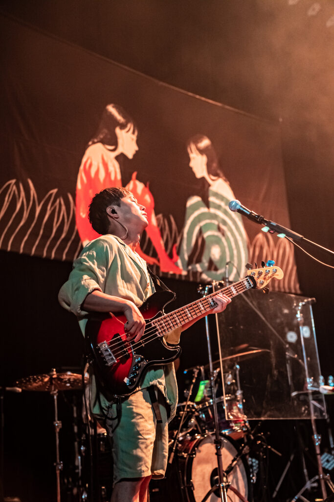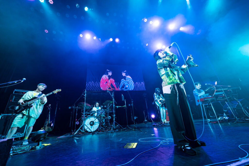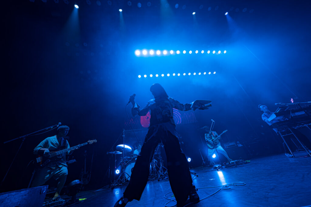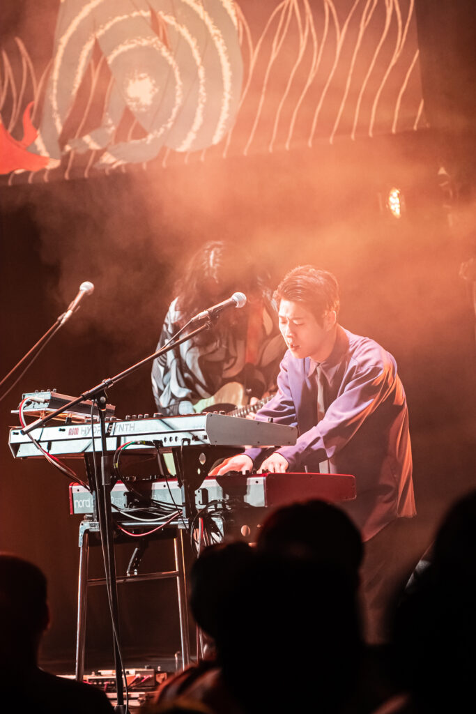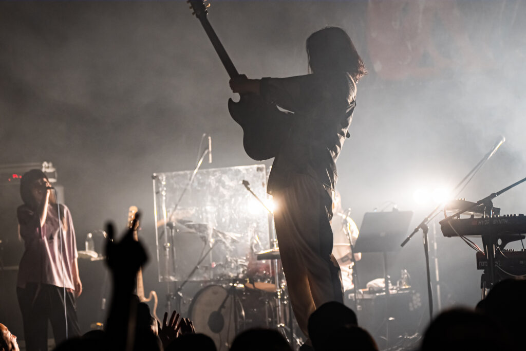 であるならば、成田の「俺、このツアーでドラマーになりました」なんて一声でドロップされた『アソビバ』は、5人の変容を最短距離で射抜いた1曲だ。佐藤謙介(Sup Dr)と羽田が交互に質感の異なるビートを響かせることで、筋肉質なダンスと浮遊感を備えたステップを混在させていく作法は、数年前ドラムの不在をキッカケにバンドとプロジェクトの境界線を模索したからこその産物と言えよう。<ここから創り出そうか 遊び場 世界中がぼくらのことを待ってる>とクリエイティビティの源泉へ切り込む詩をこのサウンドスケープに当てたのも、彼らが探し求めていたロックバンドの理想形が『アソビバ』に潜んでいるため。と同時に、成田がビートメイカーとしての産声を堂々と上げられる理由も、佐藤への絶大な信頼があるからこそだ。ファンシーなシンセサイザーが疾駆した『発色』でたっぷりと光を浴びた佐藤の姿は、まさしくその期待に応じんとしているようだった。